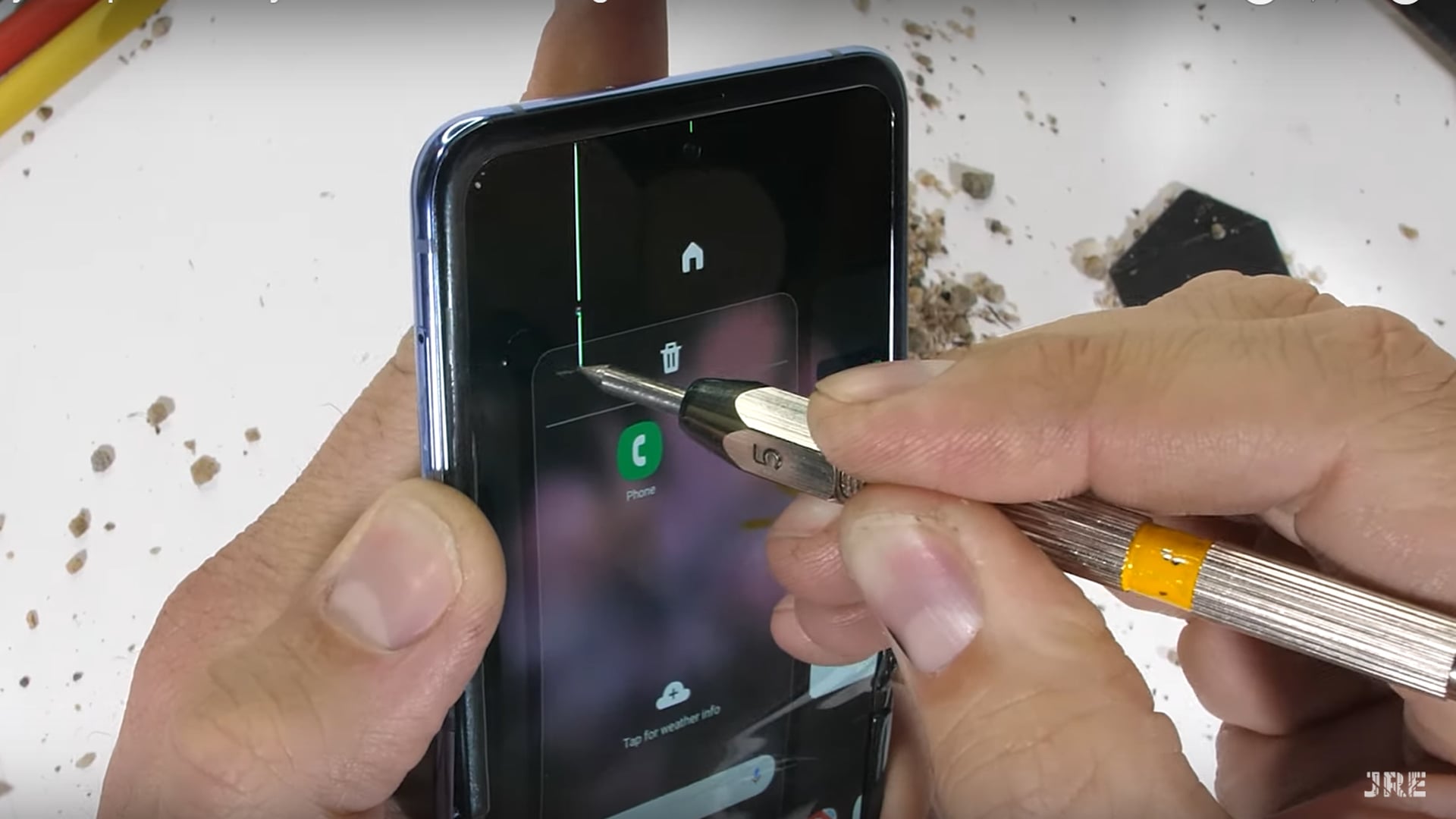 Towards the end of the video, the YouTuber pokes holes into the Galaxy Z Flip's screen, causing the pixels to go crazy and stop working. The Ultra Thin Glass doesn't show any sign of fracture, though, and there aren't any irregular bumps and lumps that we've seen on other foldable smartphones.