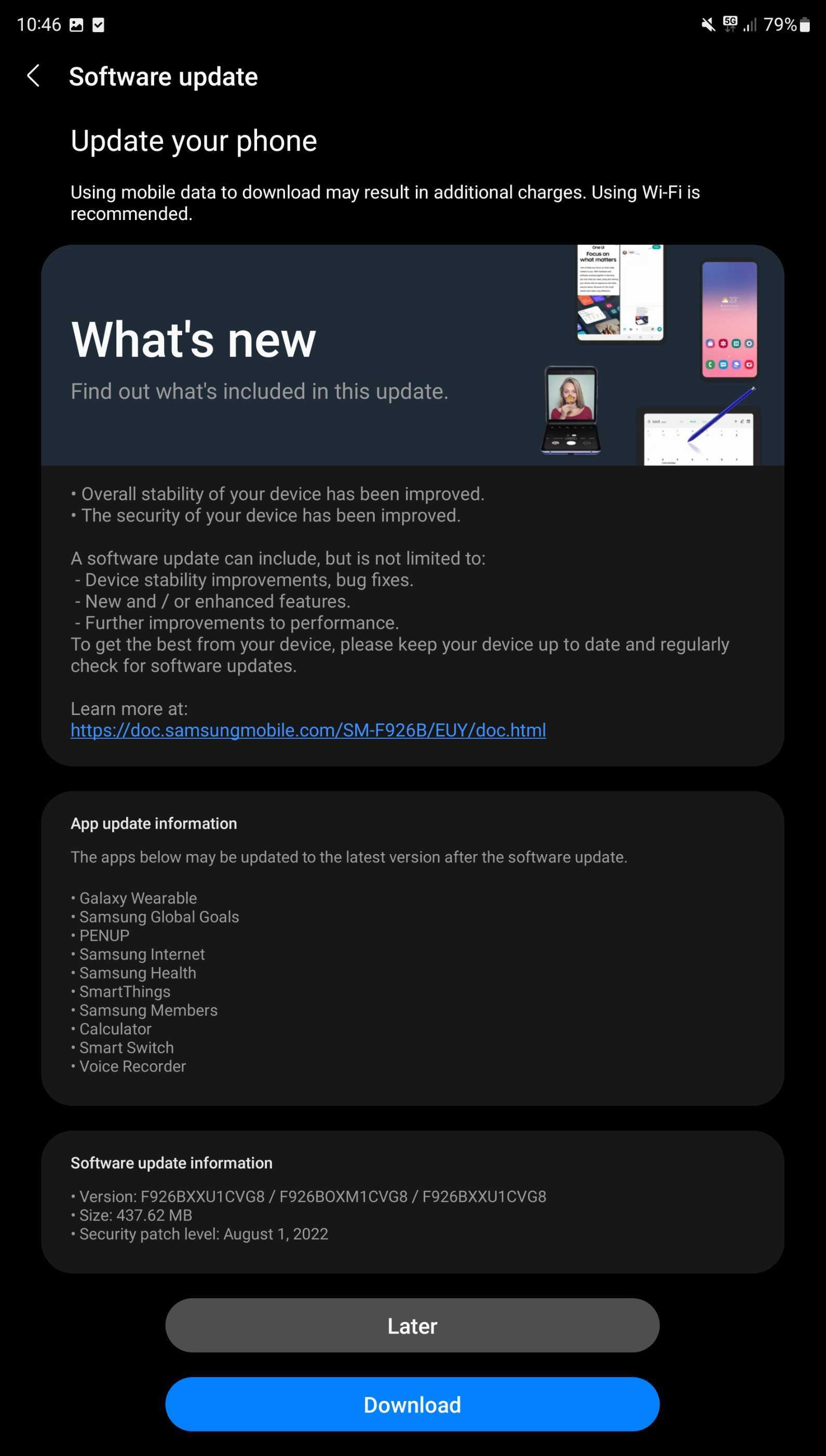 Galaxy Z Fold 3 customers can identify the new update by firmware version F926BXXU1CVG8. The update weighs almost 440MB with the August 2022 security patch included.