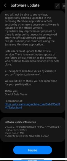 The stable Android 13 and One UI 5.0 update for the Galaxy Z Fold 4 comes with firmware version F936U1UEU1BVK3. The update is available in the US for owners of unlocked Galaxy Z Fold 4 models enrolled in the One UI 5.0 beta program. Since the fifth One UI 5.0 beta update for the Galaxy Z Fold 4 had firmware version ending ZVK3, it looks like it was stable enough to become the stable update. The update brings the November 2022 security patch to the foldable phone.