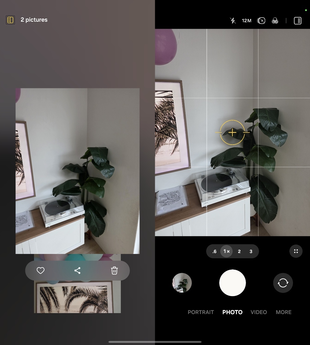 As you can see in the screenshots below, in One UI 7.0, the Camera app's Capture View displays the most recently captured image at the top. You have to tap an image to display the Delete, Like/Dislike, and Share buttons. In One UI 8.0, the most recently captured image is displayed in the middle of the screen, which makes it easier to reach. Moreover, the Delete, Like/Dislike, and Share buttons are always visible, saving you a click.