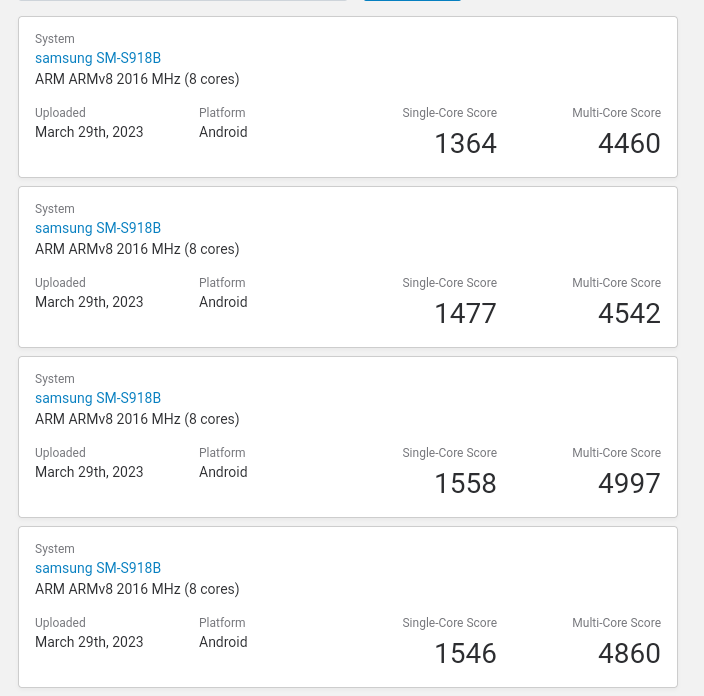 In contrast, the Galaxy S23 Ultra (SM-S918B) scores around 1,500 points in the single-core tests and anywhere between 4,400 and 5,000 points in multi-core tests. So although multi-core performance might be similar between the S23 series and the upcoming Galaxy Z Fold 5 and Z Flip 5, the 5th generation foldables have somehow scored considerably higher in single-core benchmarks, using essentially the same hardware S23.