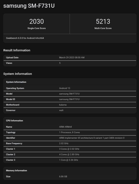 The benchmark confirms that the Galaxy Z Fold 5 (SM-F946U) and Galaxy Z Flip 5 (SM-F731U) are powered by the very same chipset as the Galaxy S23 series, namely, the Snapdragon 8 Gen 2 “for Galaxy,” which boasts a higher frequency for the primary “super” core of 3.36GHz instead of 3.2GHz.