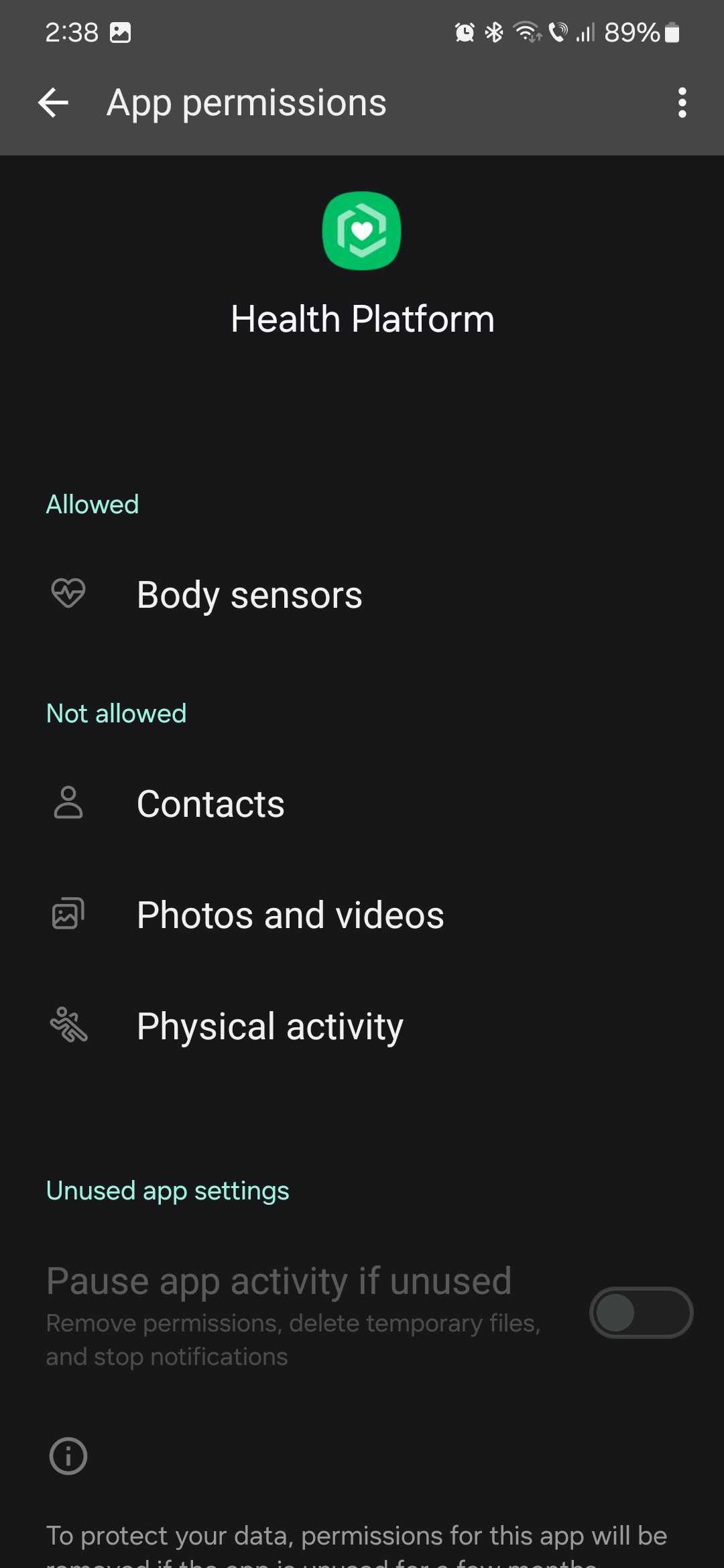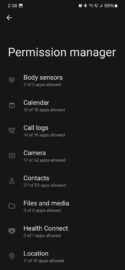 The Permission Manager menu contains almost two dozen categories, including Body sensors, Calendar, Call logs, Camera, Contacts, Files and Media, Location, and more.