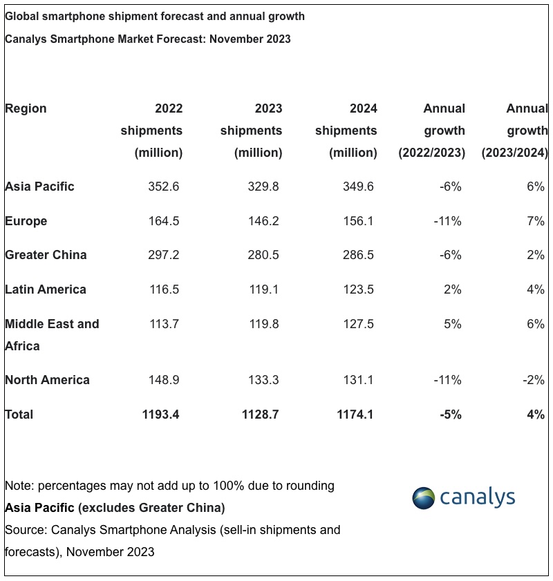 In 2024, the Asia Pacific region will see the most smartphone sales, with resurging demand from India, South Asia, and Southeast Asia. Canalys expects less than 5% of smartphones sold next year to have on-device AI capabilities. The Galaxy S24 is expected to be Samsung's first AI smartphone, featuring several AI and Generative AI capabilities, including real-time language transliteration during calls and text-to-image generation. Chinese smartphone brands, including Honor, Transsion (Infinix, Itel, and Tecno), and Xiaomi, are expected to launch in more countries globally to compete with Samsung.