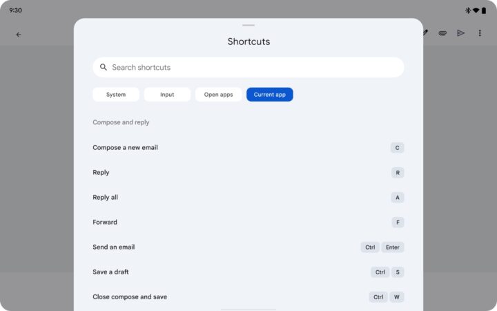 Second, now when you connect an external keyboard to your Galaxy Tab or Galaxy Fold, open Gmail, go to the compose screen, and press the ‘?’ button on it, the app will show you a list of helpful keyboard shortcuts.