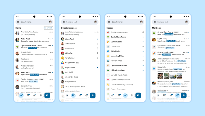 The new navigation bar gets four tabs or sections that are similar to the web version, which is on its way. The previous design only had two tabs, Chats and Spaces, on mobile. But now, you get Home, Direct messages, Spaces, and Mentions. From the Home tab, you can access all of your conversations in one unified view, in the Direct messages tab you can check all of your 1:1 conversations, Spaces shows a compact list of all your spaces, and Mentions shows you how to easily find conversations and spaces where you have been mentioned.