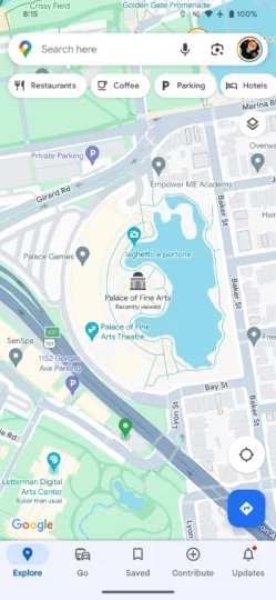 With the new Google Maps color update, the freeways are much darker now, with some blue undertones. This gives a streamlined view of all roads. The road looks much cleaner with the new colors but stands out less against the water, which uses a lighter blue shade. Restaurants now stand out with less yellow and orange-tinted pins.
