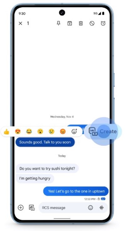 You can also add or create a new Photomoji by long-pressing the SMS text or RCS chat, scrolling to the end of the reactions bar, and tapping the ‘Create' button. Alternatively, you can use the Create button inside the emoji picker to create new Photomojis before sending them. Doing so will open the media picker for you to choose an image. Google Messages then highlights the images that you can turn into a reaction.