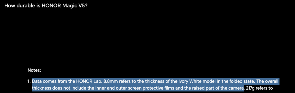 Well, if we inspect the official Honor Magic V5 global landing page, we can see that Honor used its own measurement system, and the company admits that the 8.8mm data comes from the HONOR Lab.