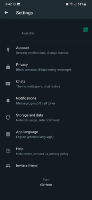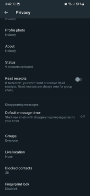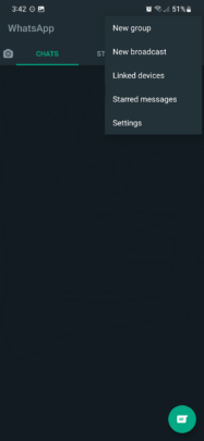 Once you've done that, open WhatsApp and tap the three-dotted button in the upper-right corner of the screen — located next to the search icon. Tap “Settings” in the pop-up menu, then go to “Privacy,” scroll down, and tap “Fingerprint lock.”