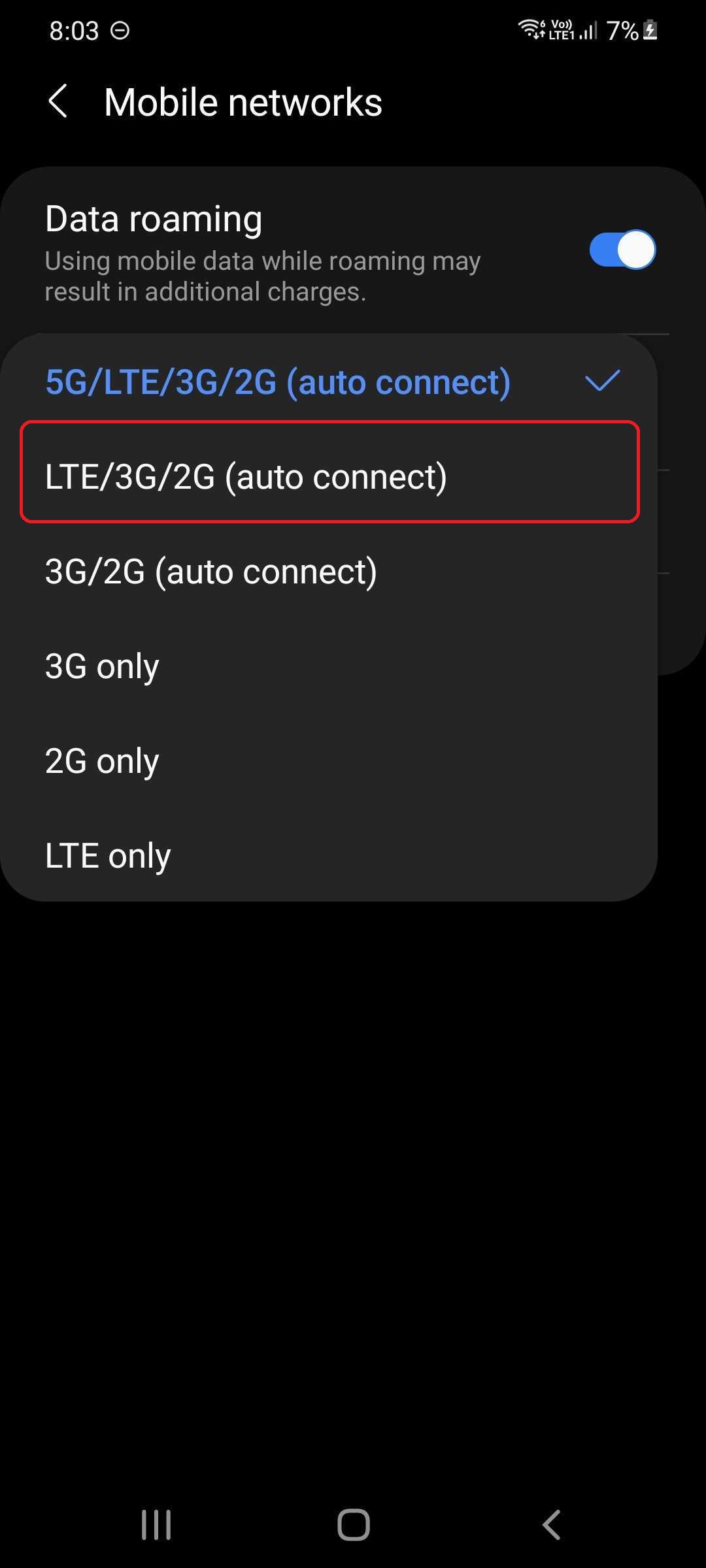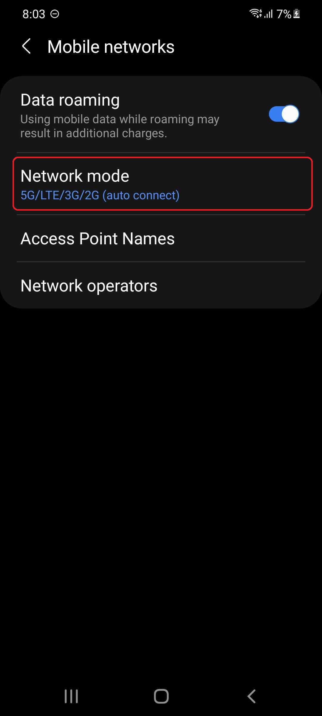 First, you'll need to open the Settings app on your Samsung Galaxy phone and access Connections. Next up, go to Mobile networks, tap Network mode, and select any option available in the drop-down menu, aside from 5G/LTE/3G/2G (auto connect).