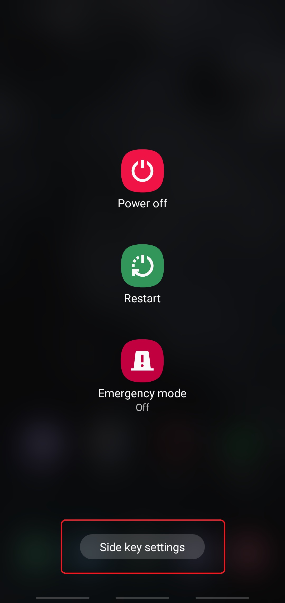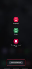 - From the power menu, tap the Side key settings option at the bottom