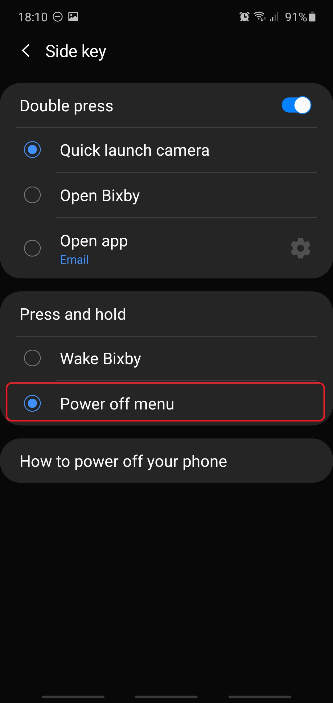 - You'll notice that the Press and hold option is set to Wake Bixby. Change this option to Power off menu
