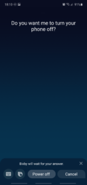- Press and hold the side key again, confirm by saying Yes and release the key. Alternatively, you can tap the Power off option in Bixby, shown at the bottom of the screen