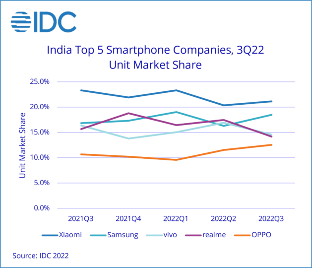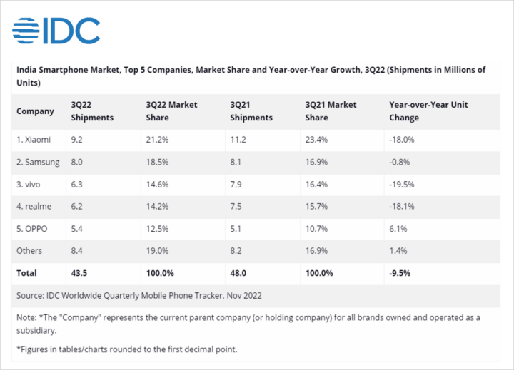 Xiaomi, which includes POCO and Redmi, led the sales in Q3 2022 with 9.2 million shipments, despite recording an 18% YoY decline. Samsung stood second with 8 million shipments. Samsung was followed by Vivo, which sat in the third position with a 19.5% YoY drop in shipment. Previously, Vivo was in second place in the 5G segment with a 15% market share.
