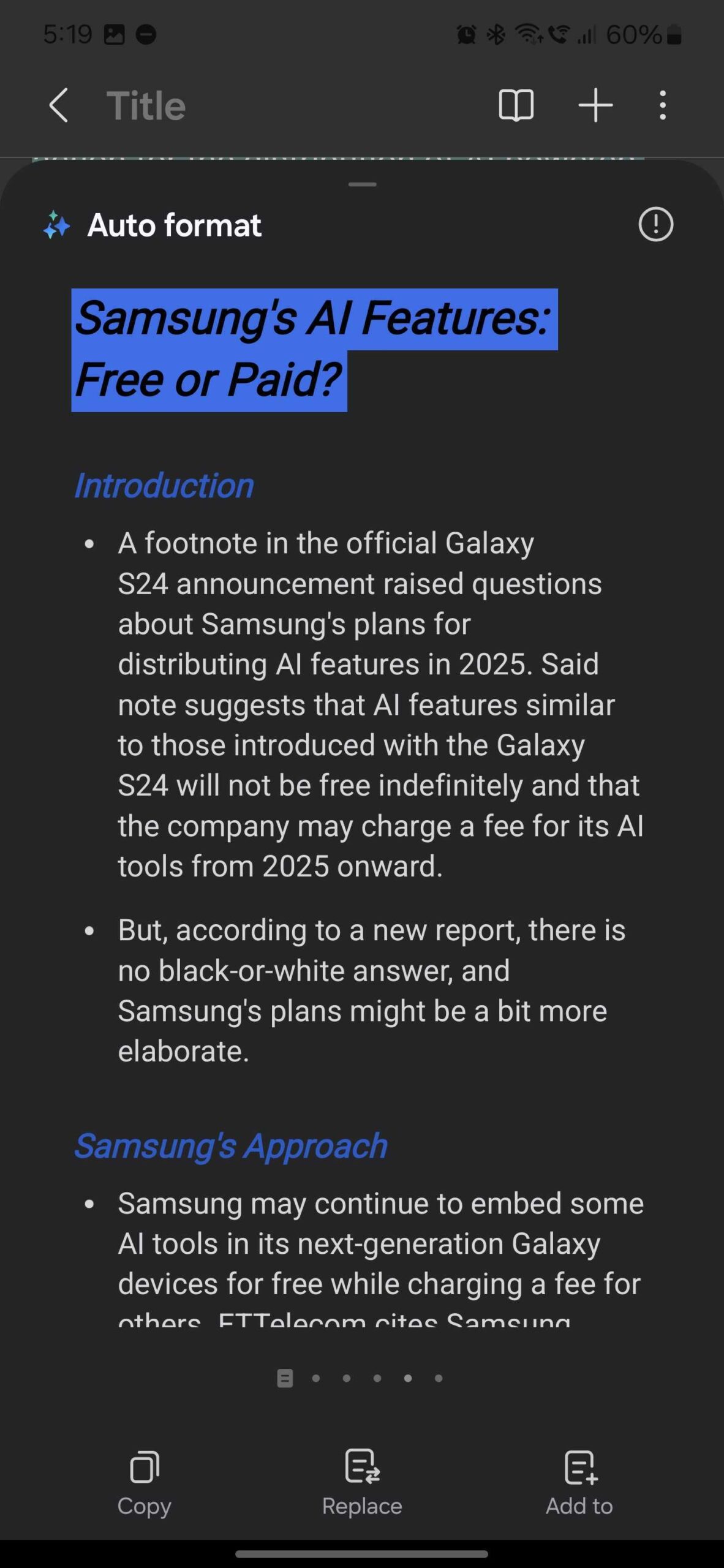 The auto-format tool works in a similar way. You can tap the AI button in the toolbar, select the text, tap “Auto-format” and choose “Headers and bullets” or “Meeting notes.” Once the AI completes the auto-format, you can choose between several format types, and once again, “Copy,” “Replace,” or “Add to.”