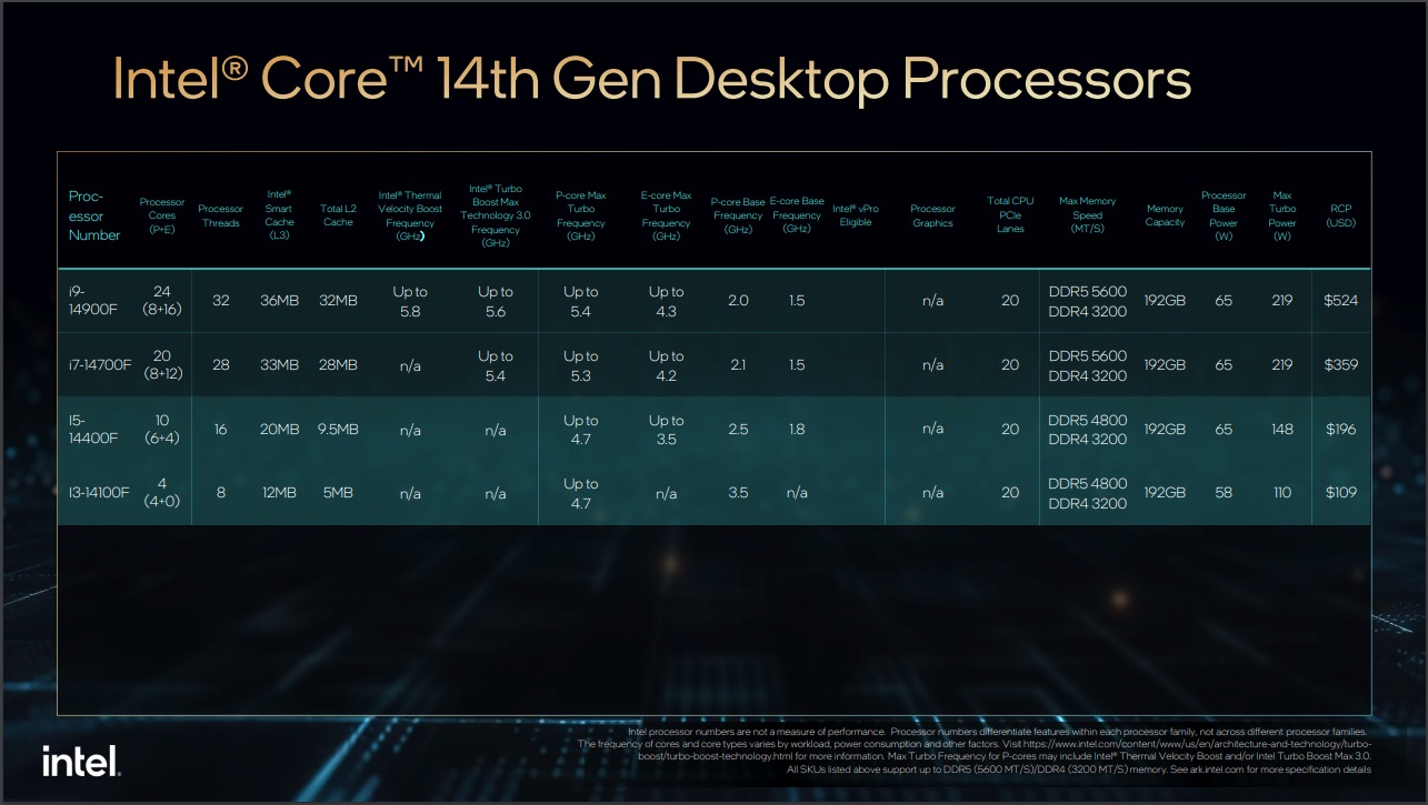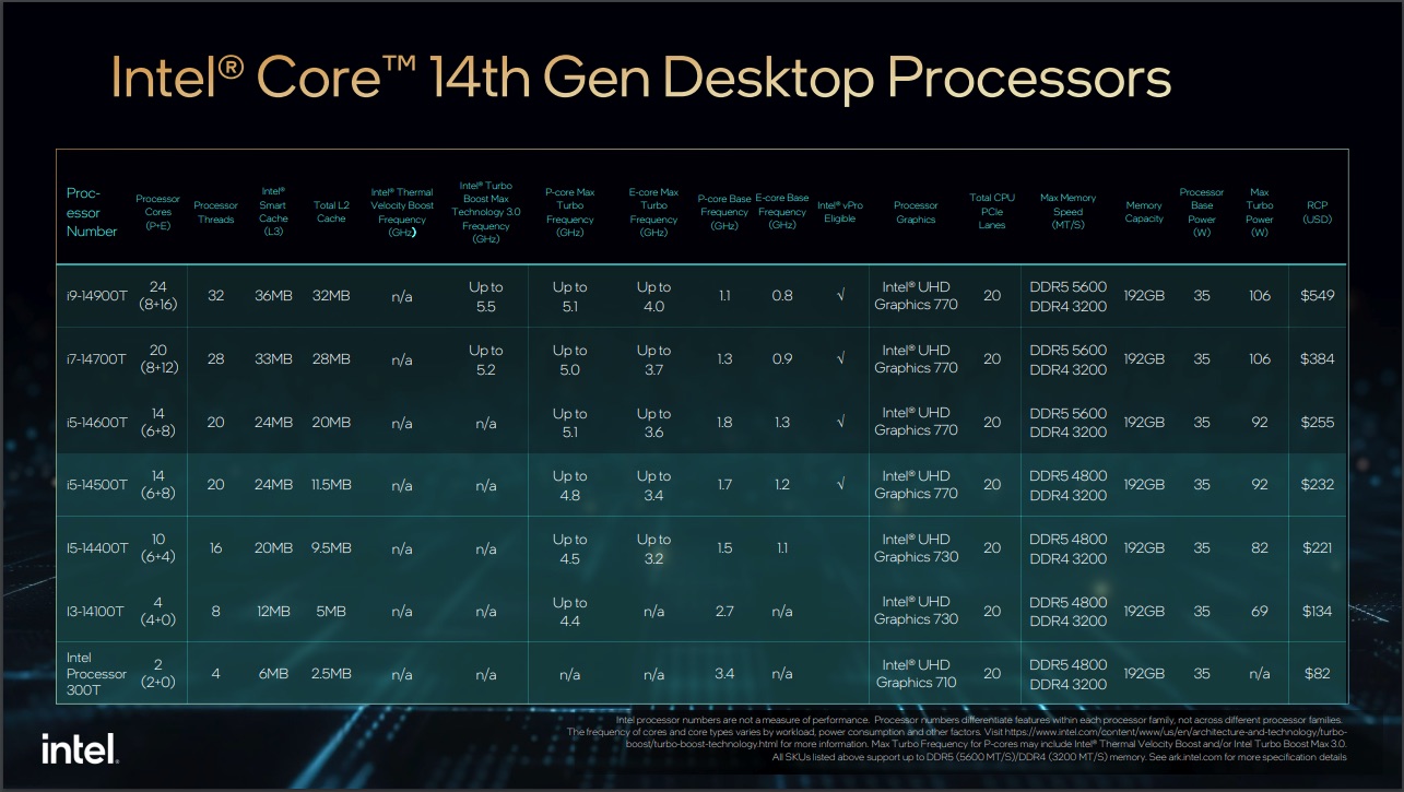 As for the new models in the 14th Gen Core lineup of processors for desktops, there are 18: i9-14900, i7-14700, i5-14600, i5-14500, i5-14400, i3-14100, 300, i9-14900F, i7-14700F, i5-14400F, i3-14100F, i9-14900T, i7-14700T, i5-14600T, i5-14500T, i5-14400T, i3-14100T, and 300T. Once again, these processors are based on the Raptor Lake architecture with improved clock speed and W-Fi 7, and some models featuring extra E-cores and greater L3 cache. These models have 35W to 65W TDP.