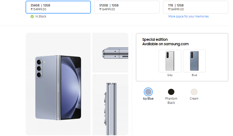 How much does the Galaxy Z Fold 5 cost? As of this writing, you can buy the Galaxy Z Fold 5 with 256GB of storage for INR 154,990 ($1,868).