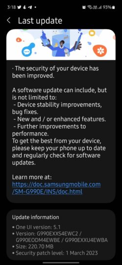 Galaxy S21 FE users can download the latest firmware with the March 2023 security patch included upon receiving the notification on their devices. Alternatively, they can try to trigger the update manually by accessing the Settings app, navigating to “Software update,” and tapping “Download and install.”