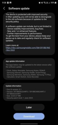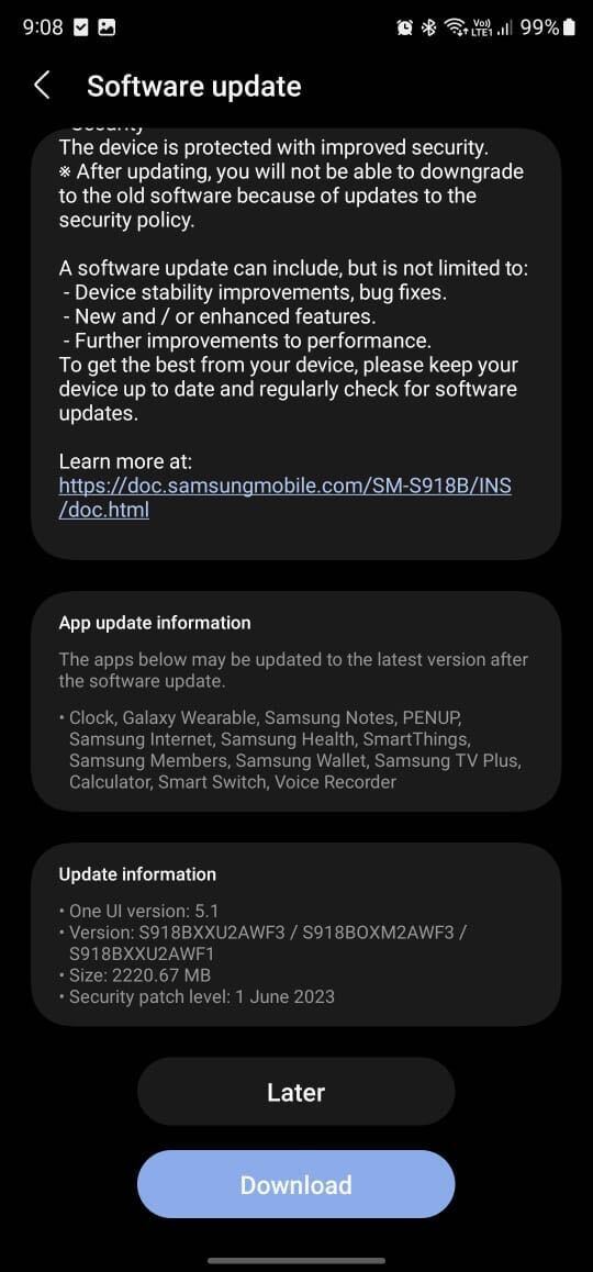 The latest software update for the Galaxy S23, Galaxy S23+, and Galaxy S23 Ultra comes with firmware version S91xBXXU2AWF3. The update has a download size of around 2.2GB and brings the June 2023 security patch. The new security patch fixes over 50 security flaws found in Galaxy phones and tablets. To install the update, navigate to Settings » Software update and tap Download and install.