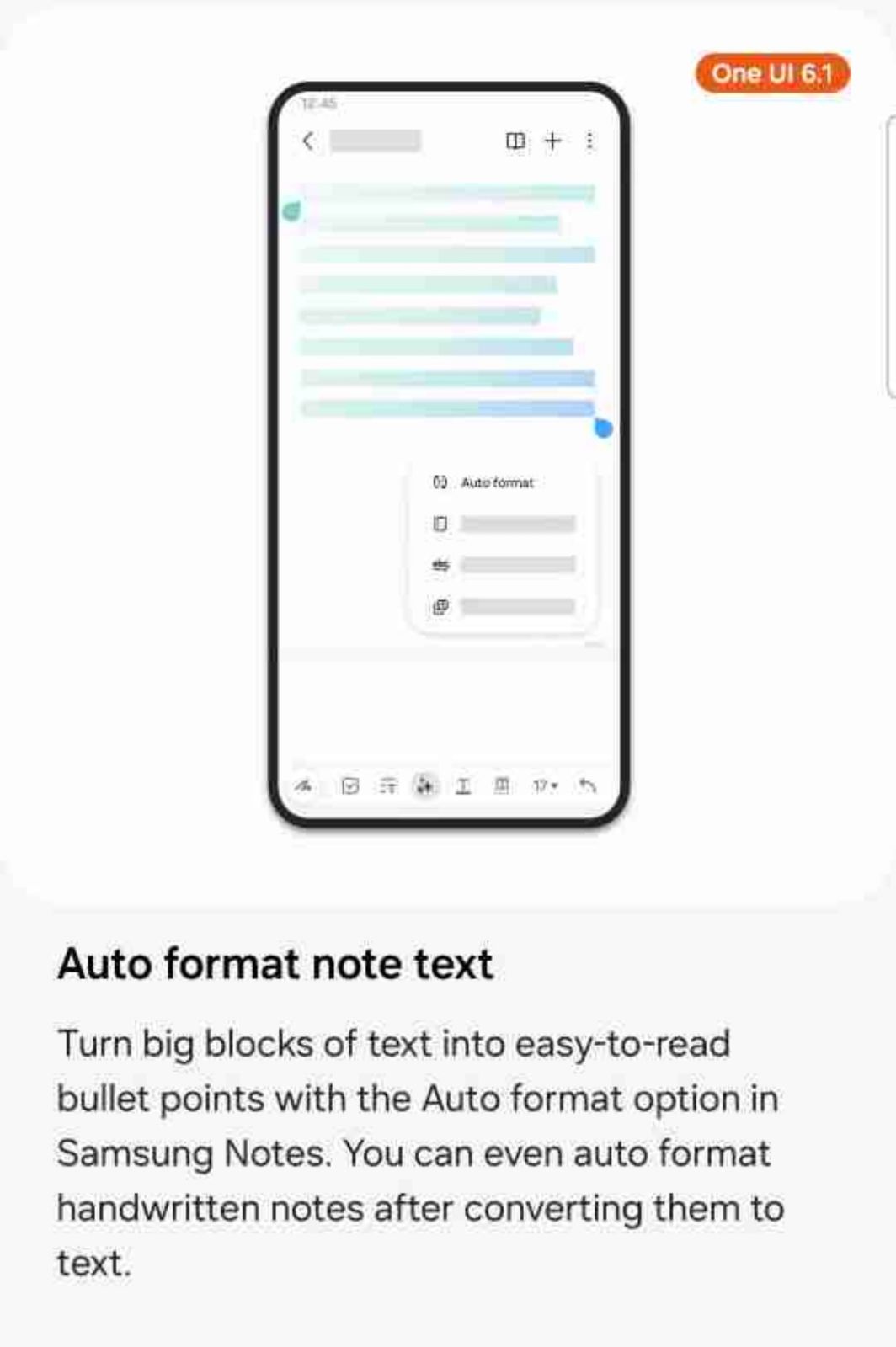 Samsung Notes will also have a feature that can summarize long notes by turning long text into easy-to-read bullet points. It can also auto-format handwritten notes after converting them to text.
