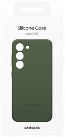 Silicone cases for the Galaxy S23 series come in navy blue, green, pink, cream, bright orange, and clear. S-View Flip Covers are shown in black, green, pink, and cream.