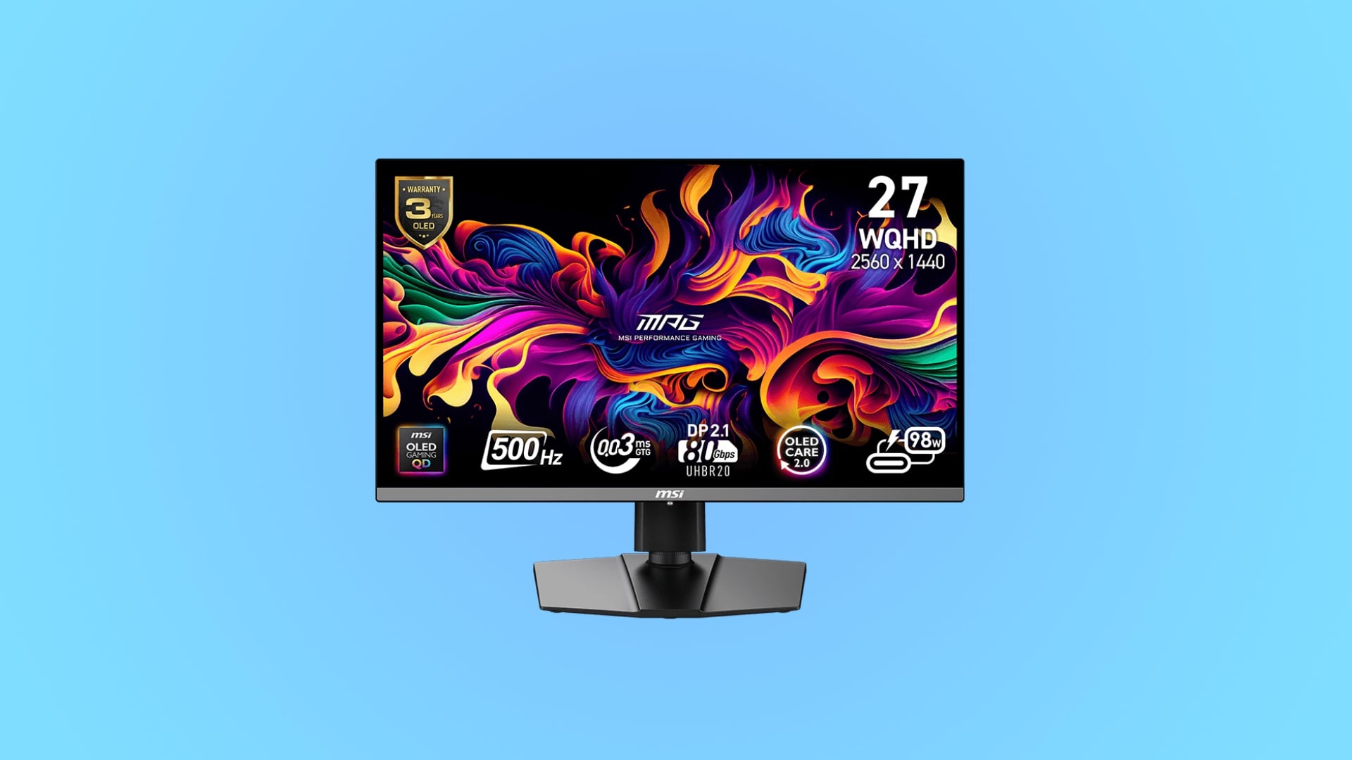 The MSI MPG 272QR has a 27-inch (technically, 26.5-inch) QD-OLED panel with QHD resolution, a 500Hz variable refresh rate, AMD FreeSync Premium Pro, and Nvidia G-Sync compatibility.