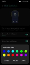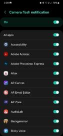 The Camera and Screen flash notification features can be turned ON or OFF for apps individually or for “All apps.” In addition, users can set a custom color for screen flash notifications by tapping the circular color switch.