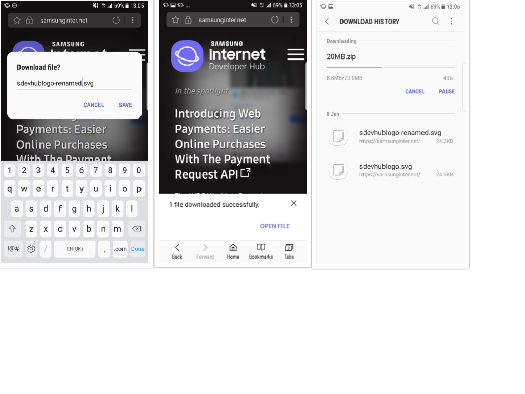 When users download a file from a website using Samsung Internet Beta v6.4, they will get a prompt which will enable them to rename the file. Once they've downloaded it, the browser will display a new prompt that lets them open it.
