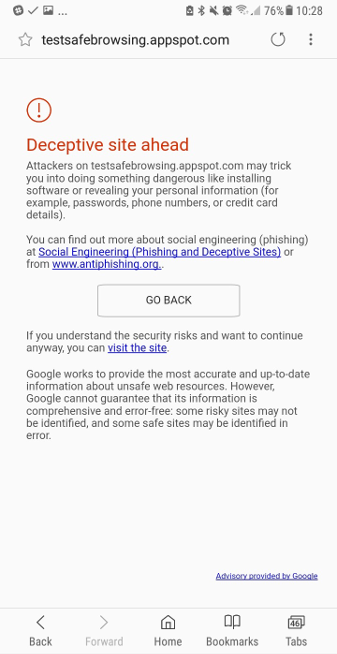 It knows when to display the warning message as the Protected Browsing feature works by checking a hash of the URL with a database of websites that are known to be dangerous. If the feature detects an unsafe website it will suggest the user go back to the previous page but if they think that there has been a mistake, they can just tap on “visit the site” to go ahead and visit it anyway.