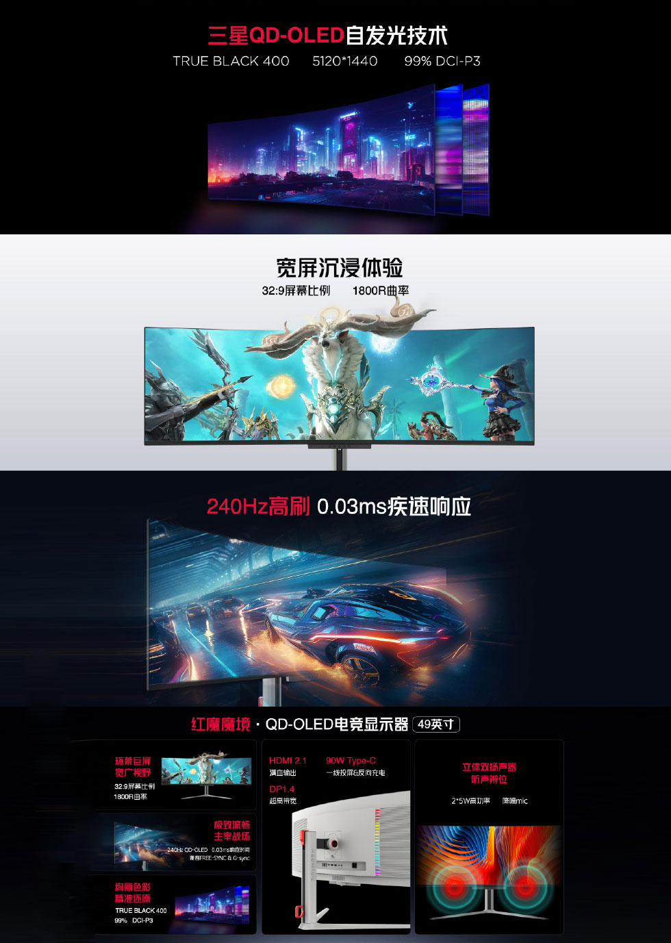 The 49″ Red Magic Realm uses a 49-inch QD-OLED panel with a 32:9 aspect ratio, 5,120 x 1,440 pixels resolution, a 240Hz refresh rate, 0.03ms GTG response time, and 1800R curvature. According to Nubia, it has a typical brightness of 400 nits and a peak brightness of 1,000 nits. Along with HDR10, it also comes with VESA DisplayHDR True Black 400 certification. The monitor is AMD FreeSync certified and Nvidia G-Sync Compatible.