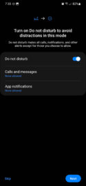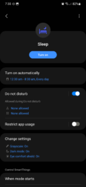 Personalize your “Do not disturb” options as desired, tap “Next,” and choose the settings you want to apply when Sleep Mode starts, such as Grayscale, Dark mode, Eye comfort shield, Power saving, and Sound mode and volume. When ready, tap “Done.”