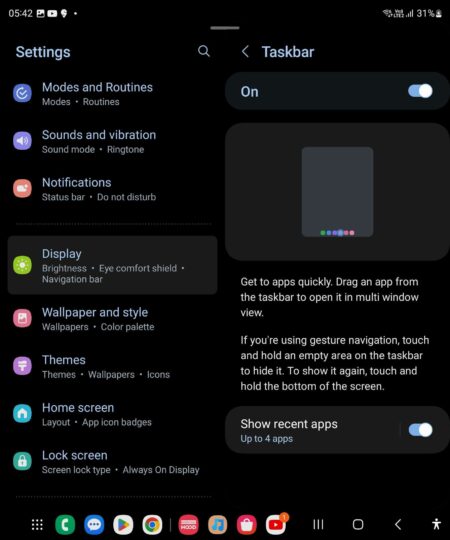 The Taskbar, introduced with One UI 4.1.1, serves multiple functions. It gives you quick access to your favorite apps so you don't have to rummage through the app drawer or go to the home screen to find them, and you can long press an app's icon on the Taskbar and drag it out to launch it in split-screen mode.