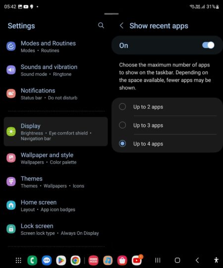 One UI 5.1.1, which is available for some Galaxy tablets and all Galaxy Z Fold smartphones except the original Galaxy Fold, allows you to have up to four recent apps on the Taskbar at any given time, and you can reduce that number to three or two by following the steps below.
