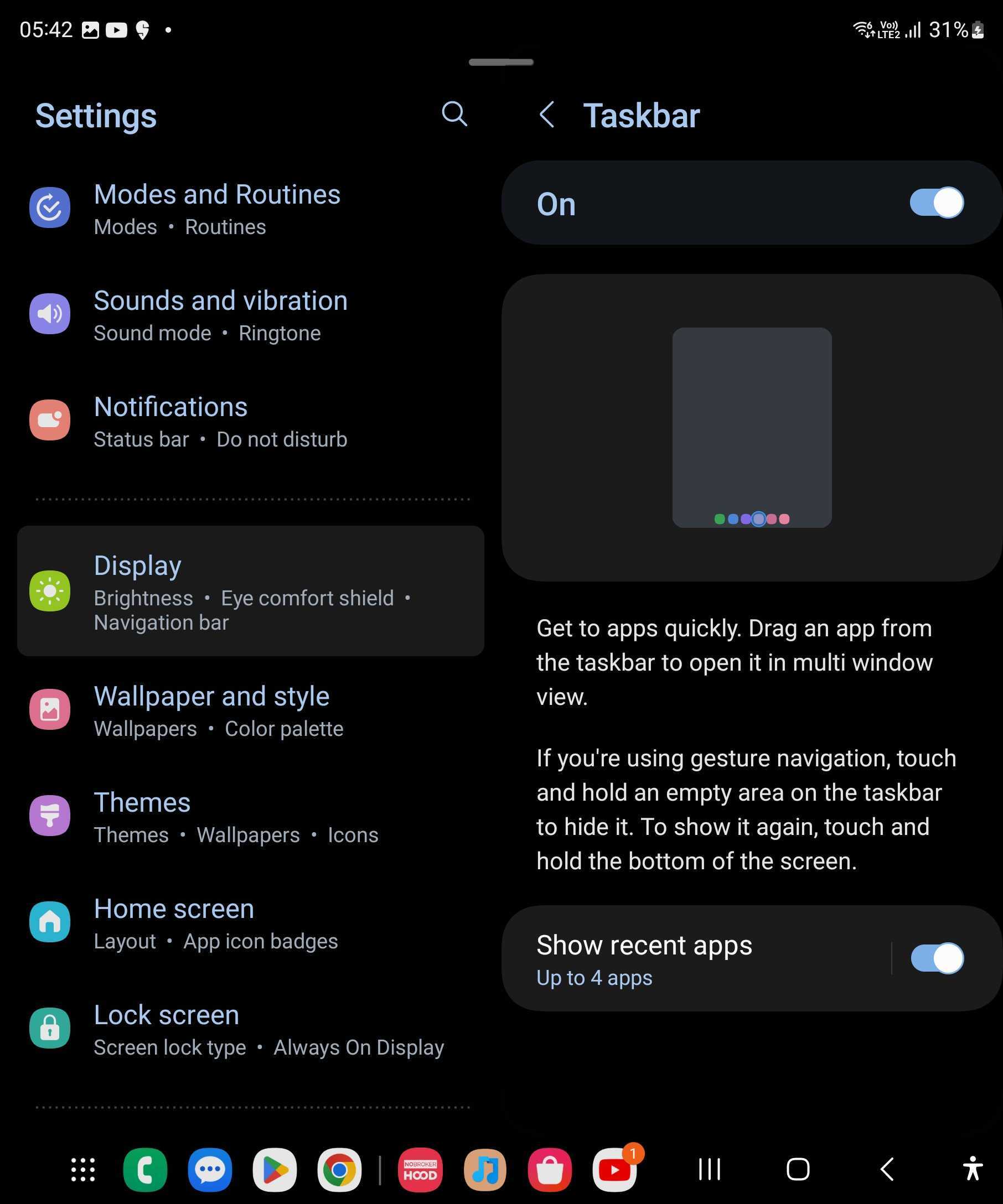 The Taskbar, introduced with One UI 4.1.1, serves multiple functions. It gives you quick access to your favorite apps so you don't have to rummage through the app drawer or go to the home screen to find them, and you can long press an app's icon on the Taskbar and drag it out to launch it in split-screen mode.