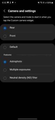 One UI 6.1 brings a new camera widget, and it is called Custom Expert RAW. Similar to the Custom Camera widget, you can use a custom title, the camera you want to use (front or rear), the camera settings, and the widget's background. For the rear camera, you can choose from three modes: Astrophoto, Multi Exposure, and ND (Neutral Density) Filter. This is an excellent feature for those who use Expert RAW app mode or have a workflow requiring a particular mode in the Expert RAW camera app. Hopefully, Samsung will add more options and settings for this widget in the future.