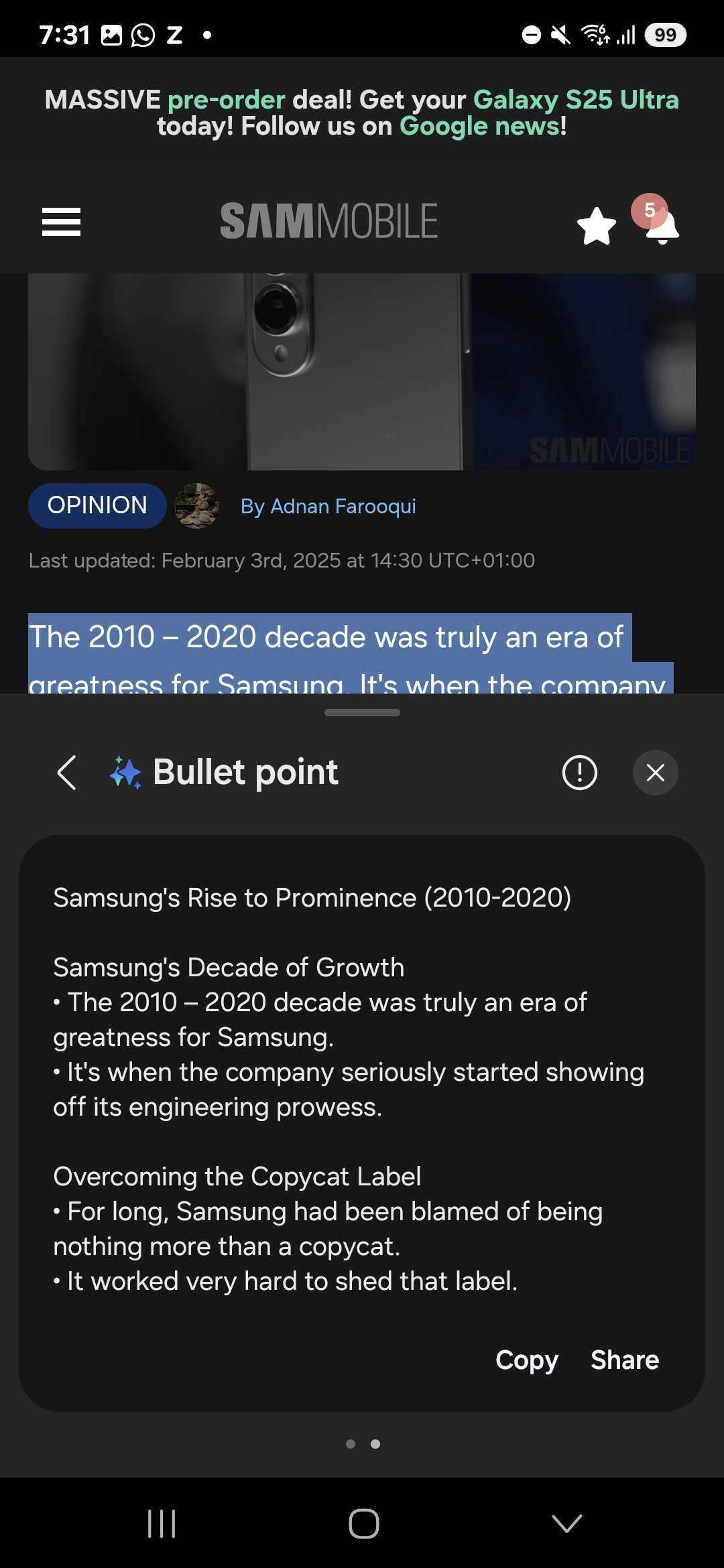 The Galaxy S25 series brings the stable version of Android 15-based One UI 7. Galaxy AI on it features Writing Assist, which offers all the features that Chat Assist does, with any keyboard. To use it, select a piece of text, and from the pop-up that you get after selecting a piece of text, select the Galaxy AI icon. Now, you should be able to see Writing Assist in the area of the keyboard. Check it out in our screenshots below.