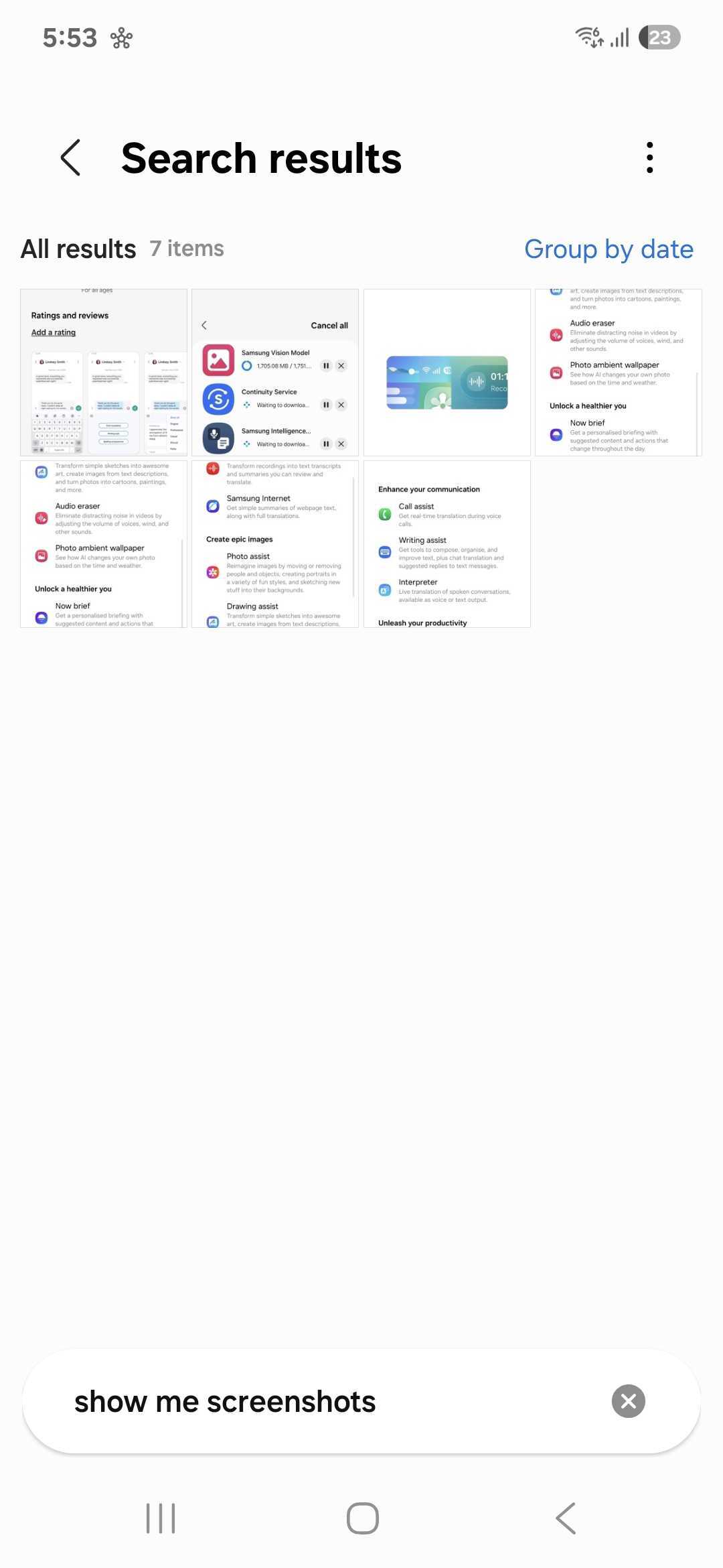 When you do the same thing on the Galaxy S23, it will not show you any results. To see screenshots, you will have to just type “screenshots,” which is simpler but you get the point. The search function in the Gallery app on the Galaxy S25 supports natural language but that on the Galaxy S23 doesn't.