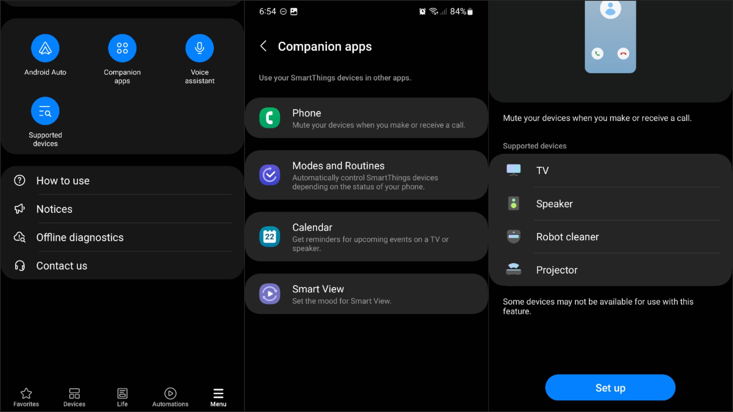 Assuming you already have the app, open it, access the “Menu” screen, and tap “Companion apps.” Next, select “Phone” from the list and tap “Set up.” You will then be asked to enable location and allow SmartThings Framework to use the location services on your device and make and manage phone calls.