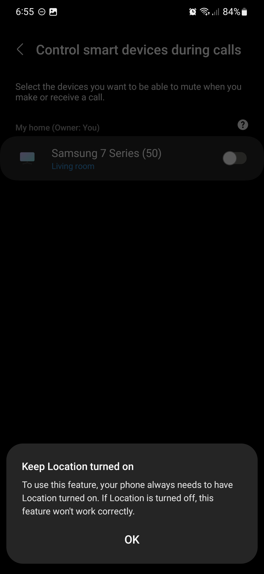 You may be asked to enable other permissions for this SmartThings feature to work. Just follow the instructions in the pop-ups and tap “Allow.” When done, you should see your Samsung TV listed in the devices that can auto-mute when you make or receive calls on your Galaxy mobile device.