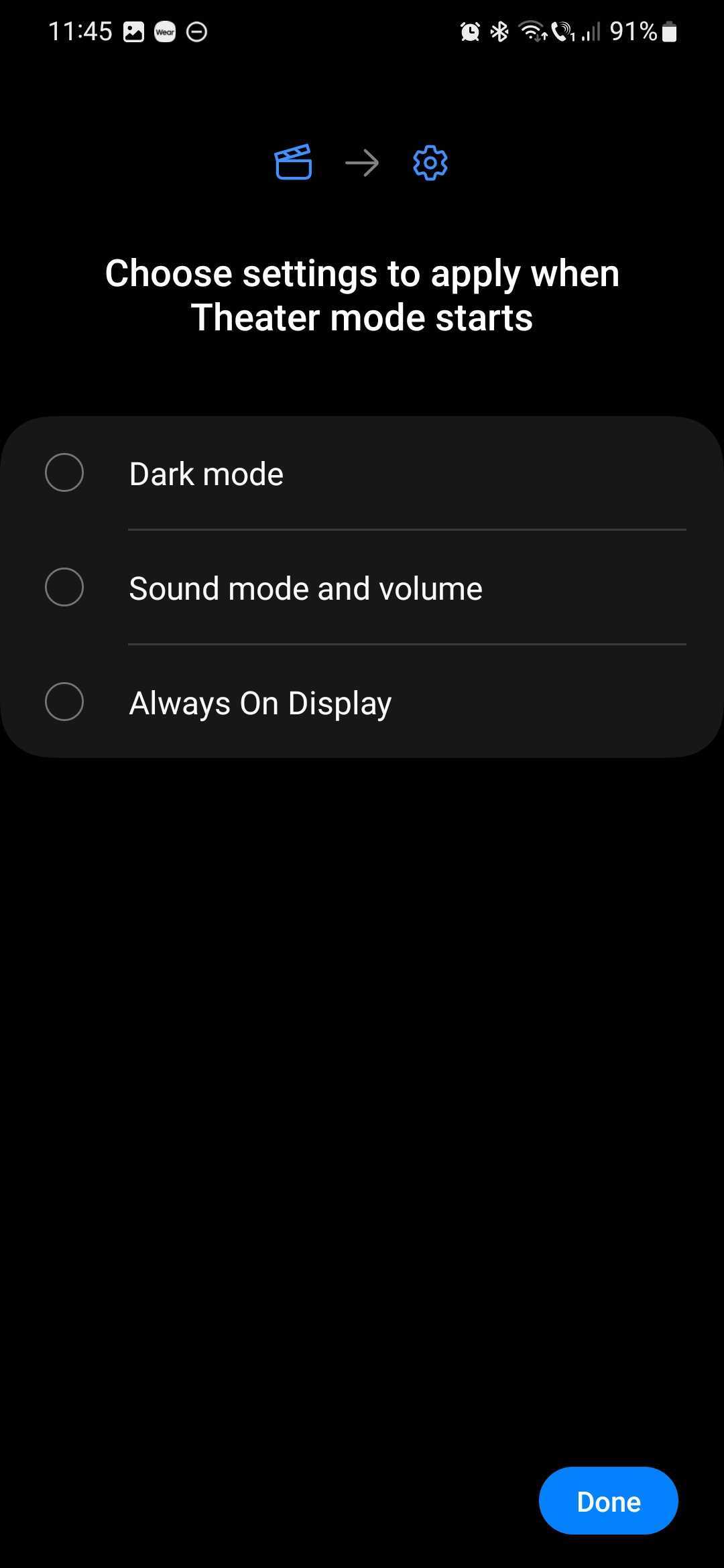 Switch to the connected smartphone and tap “Start.” Select how long you want Theater Mode to stay on, then tap “Next.” You'll also be asked to set parameters for Do Not Disturb and tweak other settings for dark mode, sound mode, and Always on Display. When you're ready, tap “Done.”