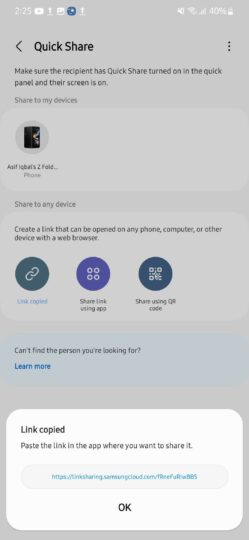 One more Quick Share enhancement includes a little guide when you use its Copy Link feature. When you copy the link, it is displayed and highlighted in a small pop-up menu. The pop-up window also explains how you can share the copied link with others or your devices.