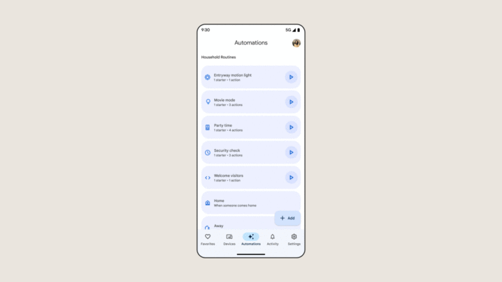 The redesigned app has five tabs (Favorites, Devices, Automations, Activity, and Settings) at the bottom of the screen, which are aimed at streamlining the controls. The most exciting one is the Favorites tab. You can add smart home devices, actions, automation, media controls, live streams from connected cameras, and much more to it for quick access to things that matter to you use the most. At the top of this section, you'll also find a carousel of tiles, each for a different type of smart home product, such as Cameras, Lighting, Climate, and so on.