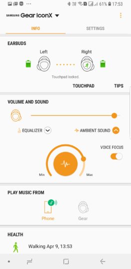 The Ambient Sound mode was one of the IconX's best features, and it worked pretty well, too. With the update, Samsung is giving the user the ability to decide just how much of the outside sound filters into the earbuds. Also new is an option – Voice Focus – that enhances human voices more than other sounds, which can be very handy when you are, say, at home and want to be able to hear when someone in the family call out your name while you're listening to your favorite tunes. This doesn't just enhance human voices; rather, it seems to generally increase the amount of sound that filters in, which is why I can also hear more clearly the sound of the keys on my mechanical keyboard at home as I type this review.