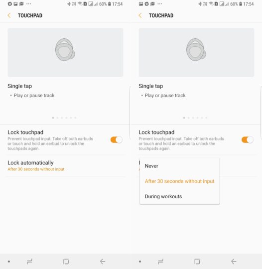 Samsung is fixing that with the new update with the Touch Lock feature. Touch Lock disables the touchpad when you need it – you can set the lock to come on automatically after 30 seconds without any touch input or when you are working out. The latter didn't seem to work very well, so the 30-second timer is the better option here. Once the touchpad is locked, it can be unlocked by tapping and holding the touchpad for a few seconds.