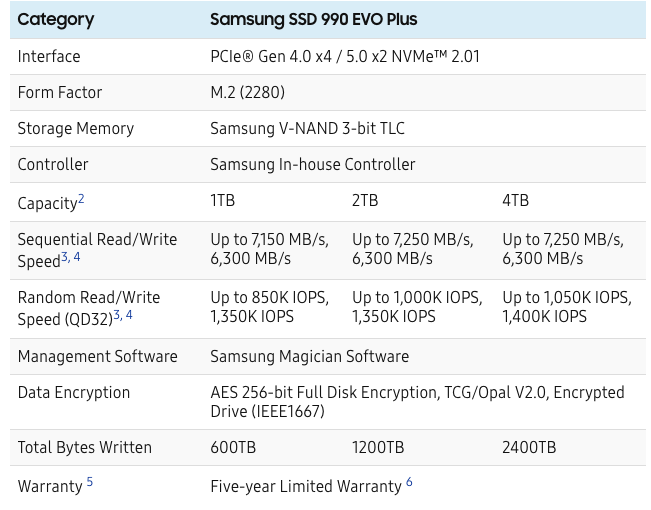 The 990 EVO Plus is a Gen5 PCIe NVMe SSD with sequential read/write speeds that almost match the 990 PRO. It tops 7,250/6,300MB/s.