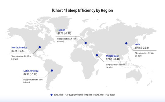 Samsung has discovered that the average sleep duration has declined across the globe from 7 hours and 3 minutes to 6 hours and 59 minutes, which is just below the 7-hour threshold recommended by the National Sleep Foundation.