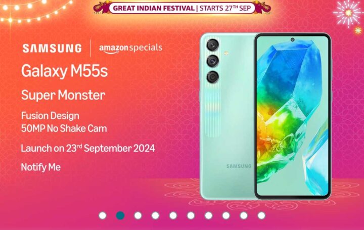 On Amazon India, we have spotted a poster about the launch of the Galaxy M55s in India. According to it, Samsung will launch the Galaxy M55s in India on 23 September 2024. The poster also says ‘Amazon Specials,’ which means that it will sold exclusively through Amazon. Clicking on the poster takes us to a page dedicated to the device, which reveals most of its specifications and features.