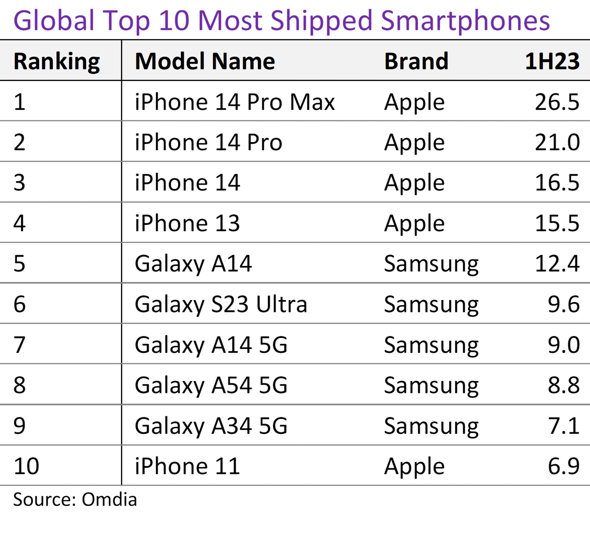 In essence, Apple and Samsung have split the top 10 list of most shipped smartphones in half. The four most shipped phones in H1 2023 were the iPhone 14 Pro Max, the iPhone 14 Pro, the iPhone 14, and the iPhone 13.