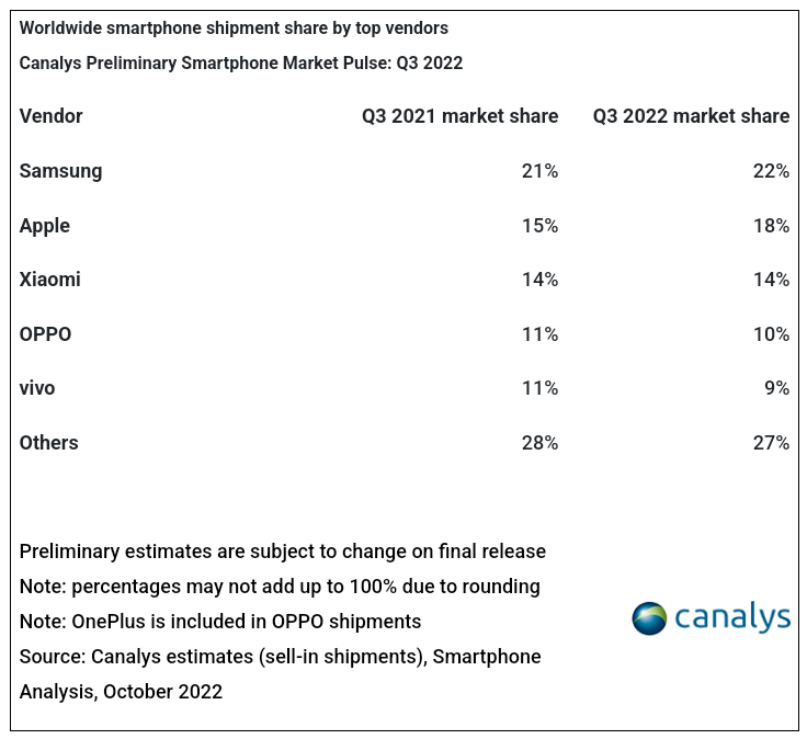 Samsung and Apple are the only two smartphone vendors that have improved their market shares, shipment-wise, in Q3 2022 compared to a year ago. Samsung's share increased by roughly 1% to 22%. Apple's performance was more impressive, having increased its smartphone shipment market share from 15% to 18% compared to last year. (via Canalys)